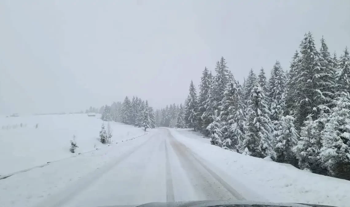 Pe drumul național DN 13A, între localitățile Vlăhița și Miercurea-Ciuc (km 112–122), traficul rutier se desfășoară în condiții de iarnă.