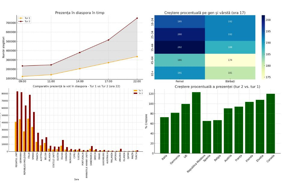 Potrivit unei analize realizate de sociologul Antonio Amuza de la Institutul Român pentru Evaluare și Strategie (IRES), prezența la vot în primele două zile a crescut cu 123% față de turul întâi, marcând o reconfigurare substanțială a dinamicii electorale în afara granițelor țării.