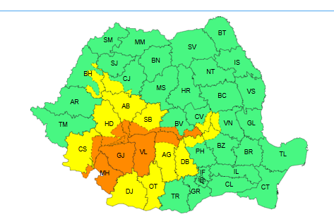 O avertizare cod portocaliu vizează intervalul 28 martie, ora 10 – 29 martie, ora 12 şi este valabilă în judeţele Mehedinţi, Gorj şi Vâlcea şi în zona de munte a judeţelor Caraş-Severin, Hunedoara, Alba, Sibiu, Braşov şi Argeş va ploua abundent.